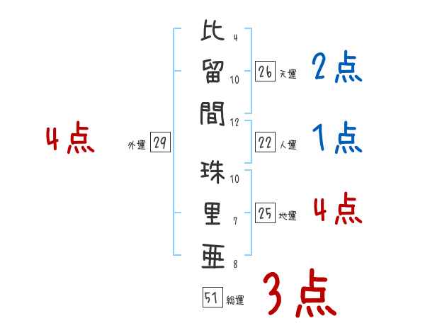 総運![]() | 比留間珠里亜さんの総運は51画の3つ星!変化が激しく、危険に注意。堅実な性格。 あなたの人生を表す1番重要な運勢です。生涯を通じて影響する総合運となり、主に50歳以降の晩年期に影響を及ぼします。 |