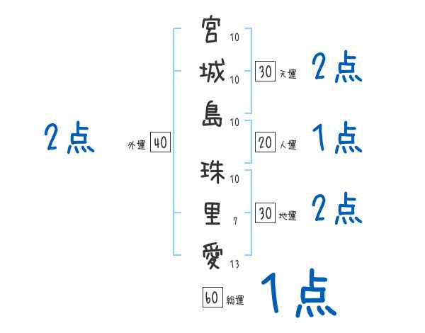 天運![]() | 宮城島珠里愛さんの天運は30画の2つ星!浮き沈みの激しさに注意しましょう。 家系が持つ宿命的な運勢を表します。祖先から受け継いだ苗字ですので自分の力が及びません。家柄を象徴します。 |