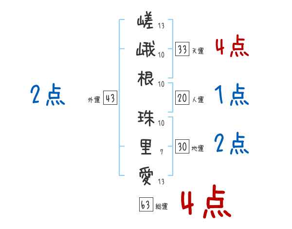 天運![]() | 嵯峨根珠里愛さんの天運は33画の4つ星!権力志向でプライドが高い。勇気があり運を切り開き成功する。 家系が持つ宿命的な運勢を表します。祖先から受け継いだ苗字ですので自分の力が及びません。家柄を象徴します。 |