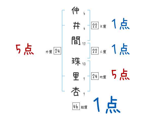 外運![]() | 仲井間珠里杏さんの外運は24画の5つ星!家庭運が良く順調な人生。金運にも恵まれる。 生活面を象徴する運勢です。外部から受ける影響力を表し、結婚運、家庭運や職場、環境への順応性を表します。 |
