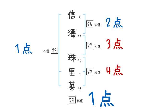 外運![]() | 信澤珠里菜さんの外運は28画の1つ星!家庭環境に注意。スポーツで活躍できる能力があるかも。 生活面を象徴する運勢です。外部から受ける影響力を表し、結婚運、家庭運や職場、環境への順応性を表します。 |