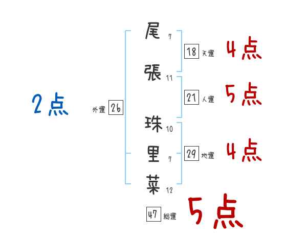総運![]() | 尾張珠里菜さんの総運は47画の5つ星!実力が開花し発展する円満な人生。財に恵まれる。 あなたの人生を表す1番重要な運勢です。生涯を通じて影響する総合運となり、主に50歳以降の晩年期に影響を及ぼします。 |