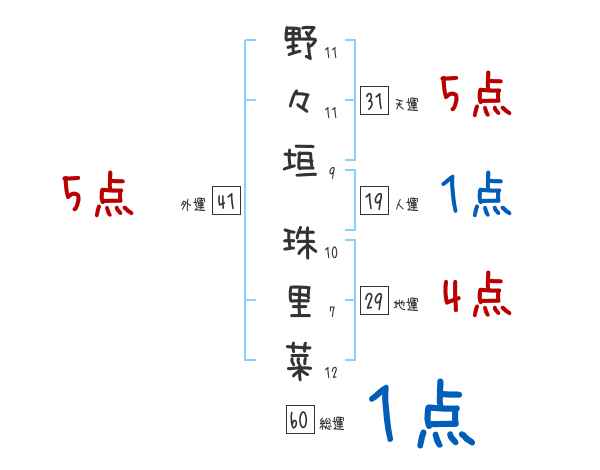 地運![]() | 野々垣珠里菜さんの地運は29画の4つ星!完全主義で才能がある。厳格な心の持ち主。 個性を表す基礎的な運勢です。性格形成や対人関係、行動力など家庭環境に影響されます。主に誕生してから20歳くらいまでの若年期の運勢を表します。 |