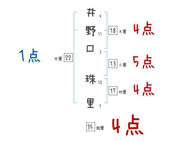天運![]() | 井野口珠里さんの天運は18画の4つ星!情熱的で剛気。忍耐力があり信頼される。 家系が持つ宿命的な運勢を表します。祖先から受け継いだ苗字ですので自分の力が及びません。家柄を象徴します。 |