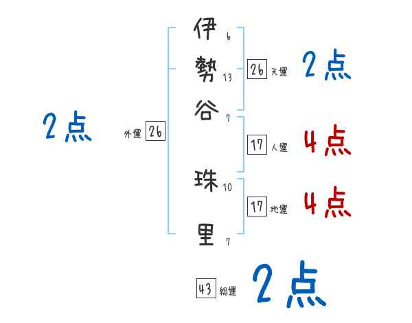 天運![]() | 伊勢谷珠里さんの天運は26画の2つ星!波瀾万丈かも。信頼できる人を大事にしましょう。 家系が持つ宿命的な運勢を表します。祖先から受け継いだ苗字ですので自分の力が及びません。家柄を象徴します。 |