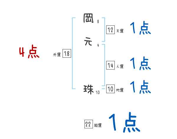 総運![]() | 岡元珠さんの総運は22画の1つ星!努力することが苦手ないっぽう手先が器用。芸術性にも優れる。 あなたの人生を表す1番重要な運勢です。生涯を通じて影響する総合運となり、主に50歳以降の晩年期に影響を及ぼします。 |