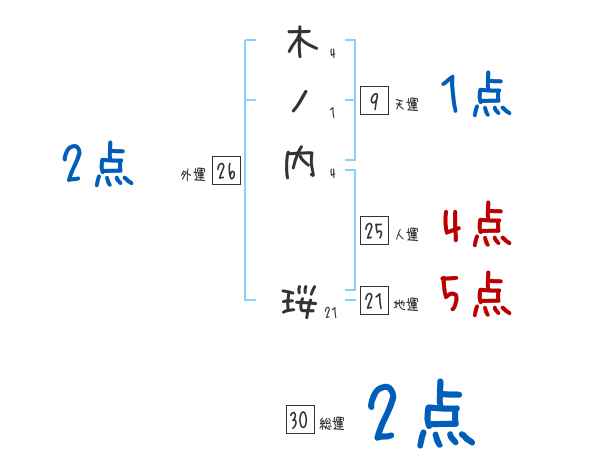 天運![]() | 木ノ内珱さんの天運は9画の1つ星!消極的で才能を発揮することが苦手なことも。周りの意見に耳を傾けましょう。 家系が持つ宿命的な運勢を表します。祖先から受け継いだ苗字ですので自分の力が及びません。家柄を象徴します。 |