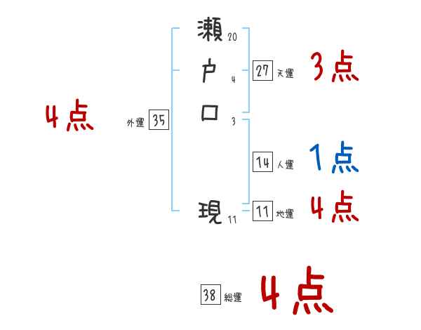 外運![]() | 瀬戸口現さんの外運は35画の4つ星!温厚な性格で感受性が高い。穏和な性格で人望が厚い。 生活面を象徴する運勢です。外部から受ける影響力を表し、結婚運、家庭運や職場、環境への順応性を表します。 |