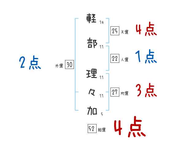 総運![]() | 軽部理々加さんの総運は52画の4つ星!先見性と独創性に優れ考える力がある。強運の持ち主。 あなたの人生を表す1番重要な運勢です。生涯を通じて影響する総合運となり、主に50歳以降の晩年期に影響を及ぼします。 |