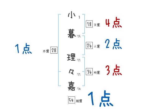 外運![]() | 小暮理々嘉さんの外運は28画の1つ星!家庭環境に注意。スポーツで活躍できる能力があるかも。 生活面を象徴する運勢です。外部から受ける影響力を表し、結婚運、家庭運や職場、環境への順応性を表します。 |