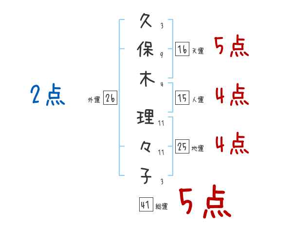 天運![]() | 久保木理々子さんの天運は16画の5つ星!人望が厚く大きく発展する。逆転成功が見える。 家系が持つ宿命的な運勢を表します。祖先から受け継いだ苗字ですので自分の力が及びません。家柄を象徴します。 |