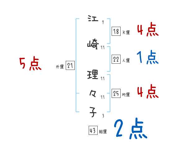 天運![]() | 江崎理々子さんの天運は18画の4つ星!情熱的で剛気。忍耐力があり信頼される。 家系が持つ宿命的な運勢を表します。祖先から受け継いだ苗字ですので自分の力が及びません。家柄を象徴します。 |