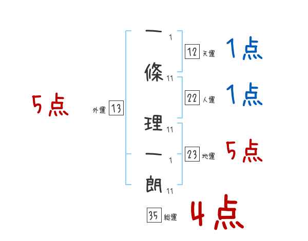外運![]() | 一條理一朗さんの外運は13画の5つ星!才能に恵まれ人気がある。名声を手に入れる。円満な人生。 生活面を象徴する運勢です。外部から受ける影響力を表し、結婚運、家庭運や職場、環境への順応性を表します。 |