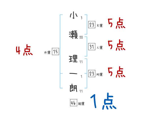 総運![]() | 小瀬理一朗さんの総運は46画の1つ星!迷走することが多く苦労するかも。目先のことにとらわれないように。 あなたの人生を表す1番重要な運勢です。生涯を通じて影響する総合運となり、主に50歳以降の晩年期に影響を及ぼします。 |