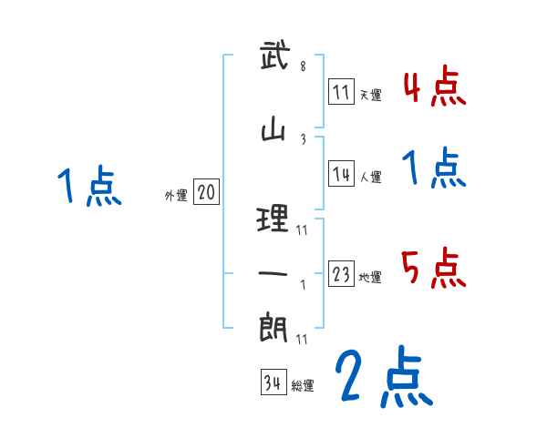 天運![]() | 武山理一朗さんの天運は11画の4つ星!着実に富や地位を得る幸運な人生。 家系が持つ宿命的な運勢を表します。祖先から受け継いだ苗字ですので自分の力が及びません。家柄を象徴します。 |