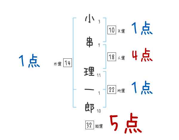 総運![]() | 小串理一郎さんの総運は32画の5つ星!柔軟性があり成功する。チャンスが多く金運が良い。 あなたの人生を表す1番重要な運勢です。生涯を通じて影響する総合運となり、主に50歳以降の晩年期に影響を及ぼします。 |