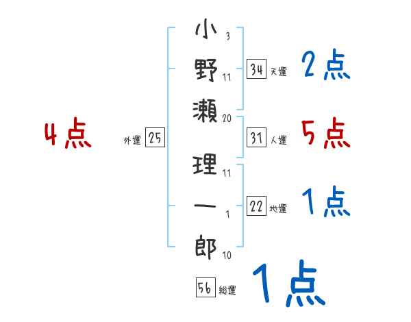 天運![]() | 小野瀬理一郎さんの天運は34画の2つ星!独創性に優れるが、自尊心が強く災難に注意しましょう。 家系が持つ宿命的な運勢を表します。祖先から受け継いだ苗字ですので自分の力が及びません。家柄を象徴します。 |