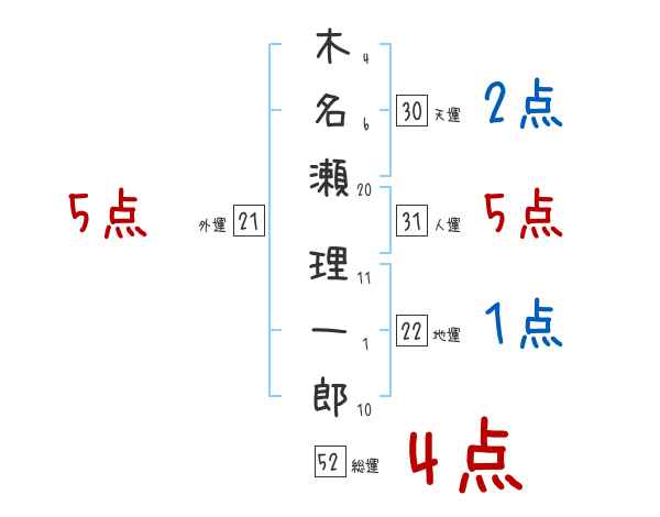 天運![]() | 木名瀬理一郎さんの天運は30画の2つ星!浮き沈みの激しさに注意しましょう。 家系が持つ宿命的な運勢を表します。祖先から受け継いだ苗字ですので自分の力が及びません。家柄を象徴します。 |