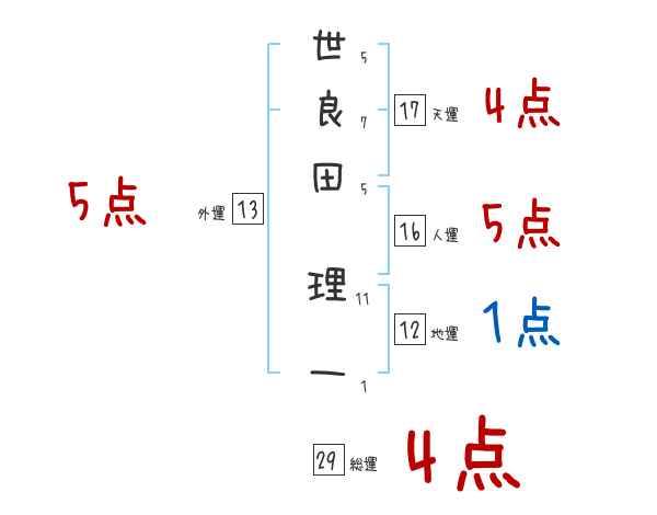 | 人運  | 世良田理一さんの人運は16画の5つ星!人望が厚く大きく発展する。逆転成功が見える。性格や才能などを表す2番目に重要な運勢です。人間関係や協調性、社会的な成功に影響します。主に20歳から50歳ぐらいまでの中年期の運勢を表します。 |