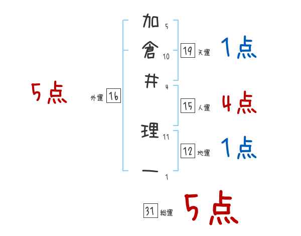 天運![]() | 加倉井理一さんの天運は19画の1つ星!優れた才能を持ちますが、協調性が足りないことも。周りの人と協力する事を意識しましょう。 家系が持つ宿命的な運勢を表します。祖先から受け継いだ苗字ですので自分の力が及びません。家柄を象徴します。 |