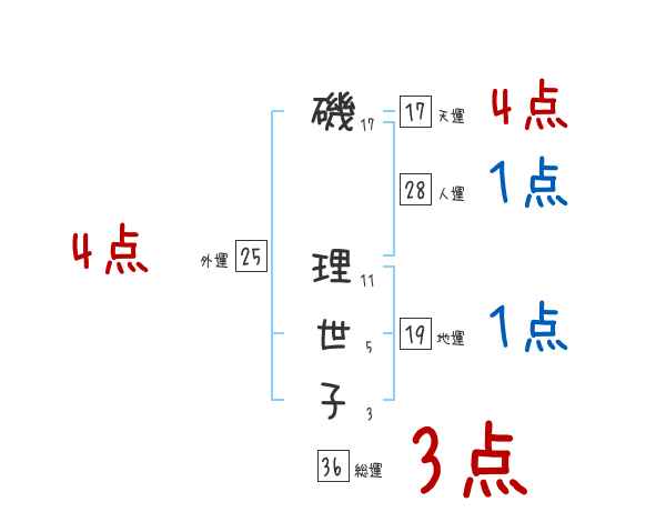 天運![]() | 磯理世子さんの天運は17画の4つ星!積極的な行動力。地位を気づき財産を手に入れる。純粋な心と直感力。 家系が持つ宿命的な運勢を表します。祖先から受け継いだ苗字ですので自分の力が及びません。家柄を象徴します。 |