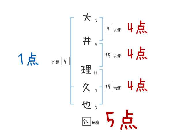 天運![]() | 大井理久也さんの天運は7画の4つ星!強い意志や信念を持ち独立心が強い。自立する。 家系が持つ宿命的な運勢を表します。祖先から受け継いだ苗字ですので自分の力が及びません。家柄を象徴します。 |