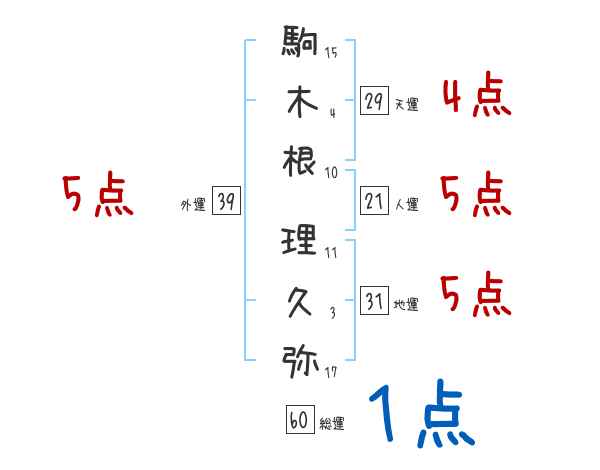 外運![]() | 駒木根理久弥さんの外運は39画の5つ星!社交性に優れ人望が厚い。人の上に立ち成功する。 生活面を象徴する運勢です。外部から受ける影響力を表し、結婚運、家庭運や職場、環境への順応性を表します。 |