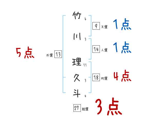 天運![]() | 竹川理久斗さんの天運は9画の1つ星!消極的で才能を発揮することが苦手なことも。周りの意見に耳を傾けましょう。 家系が持つ宿命的な運勢を表します。祖先から受け継いだ苗字ですので自分の力が及びません。家柄を象徴します。 |