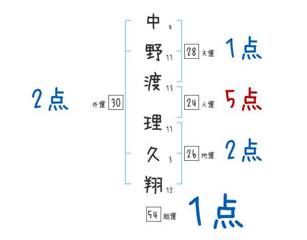 天運![]() | 中野渡理久翔さんの天運は28画の1つ星!家庭環境に注意。スポーツで活躍できる能力があるかも。 家系が持つ宿命的な運勢を表します。祖先から受け継いだ苗字ですので自分の力が及びません。家柄を象徴します。 |