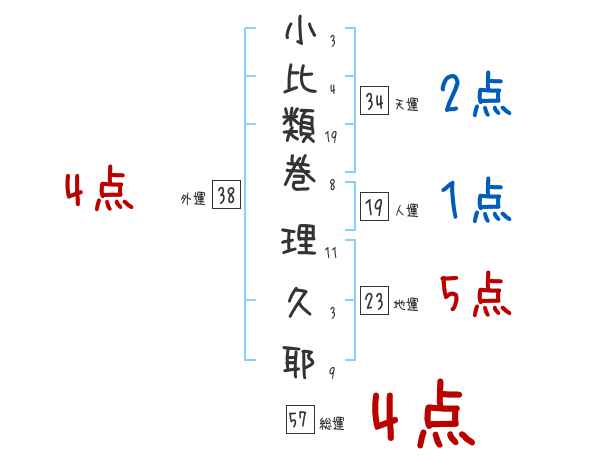 天運![]() | 小比類巻理久耶さんの天運は34画の2つ星!独創性に優れるが、自尊心が強く災難に注意しましょう。 家系が持つ宿命的な運勢を表します。祖先から受け継いだ苗字ですので自分の力が及びません。家柄を象徴します。 |