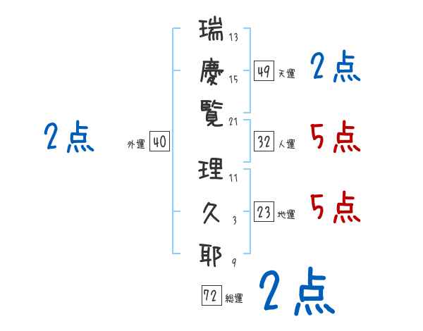 人運![]() | 瑞慶覧理久耶さんの人運は32画の5つ星!柔軟性があり成功する。チャンスが多く金運が良い。 性格や才能などを表す2番目に重要な運勢です。人間関係や協調性、社会的な成功に影響します。主に20歳から50歳ぐらいまでの中年期の運勢を表します。 |