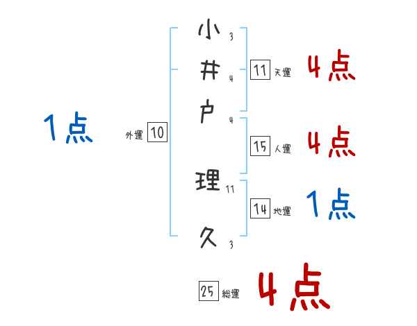天運![]() | 小井戸理久さんの天運は11画の4つ星!着実に富や地位を得る幸運な人生。 家系が持つ宿命的な運勢を表します。祖先から受け継いだ苗字ですので自分の力が及びません。家柄を象徴します。 |