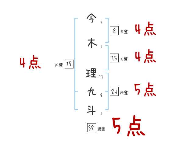 総運![]() | 今木理九斗さんの総運は32画の5つ星!柔軟性があり成功する。チャンスが多く金運が良い。 あなたの人生を表す1番重要な運勢です。生涯を通じて影響する総合運となり、主に50歳以降の晩年期に影響を及ぼします。 |