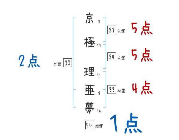 天運![]() | 京極理亜夢さんの天運は21画の5つ星!統率力がある。独立し成功する。名誉を手に入れる。 家系が持つ宿命的な運勢を表します。祖先から受け継いだ苗字ですので自分の力が及びません。家柄を象徴します。 |