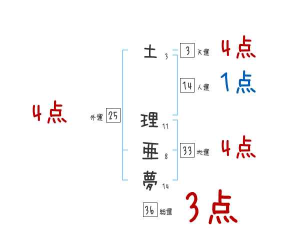 天運![]() | 土理亜夢さんの天運は3画の4つ星!活動的で才能に恵まれ、多くの信頼を得る。希望に満ち成長する。 家系が持つ宿命的な運勢を表します。祖先から受け継いだ苗字ですので自分の力が及びません。家柄を象徴します。 |