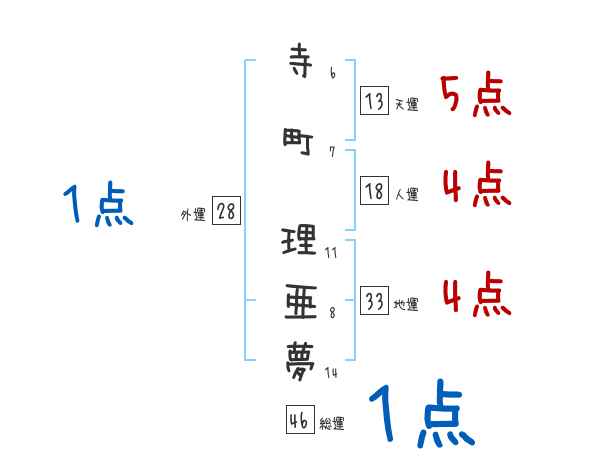 総運![]() | 寺町理亜夢さんの総運は46画の1つ星!迷走することが多く苦労するかも。目先のことにとらわれないように。 あなたの人生を表す1番重要な運勢です。生涯を通じて影響する総合運となり、主に50歳以降の晩年期に影響を及ぼします。 |