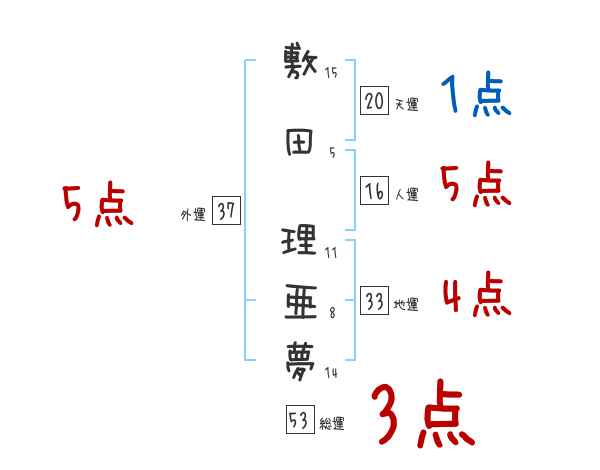 総運![]() | 敷田理亜夢さんの総運は53画の3つ星!やや見栄っ張りで虚栄心がある。散財に注意。 あなたの人生を表す1番重要な運勢です。生涯を通じて影響する総合運となり、主に50歳以降の晩年期に影響を及ぼします。 |