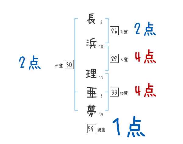 天運![]()  | 長浜理亜夢さんの天運は26画の2つ星!波瀾万丈かも。信頼できる人を大事にしましょう。 家系が持つ宿命的な運勢を表します。祖先から受け継いだ苗字ですので自分の力が及びません。家柄を象徴します。 |