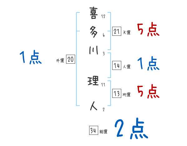 総運![]() | 喜多川理人さんの総運は34画の2つ星!独創性に優れるが、自尊心が強く災難に注意しましょう。 あなたの人生を表す1番重要な運勢です。生涯を通じて影響する総合運となり、主に50歳以降の晩年期に影響を及ぼします。 |