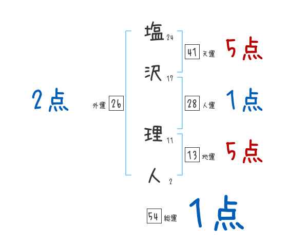人運![]() | 塩沢理人さんの人運は28画の1つ星!家庭環境に注意。スポーツで活躍できる能力があるかも。 性格や才能などを表す2番目に重要な運勢です。人間関係や協調性、社会的な成功に影響します。主に20歳から50歳ぐらいまでの中年期の運勢を表します。 |