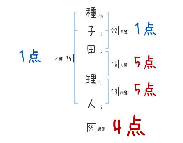 外運![]() | 種子田理人さんの外運は19画の1つ星!優れた才能を持ちますが、協調性が足りないことも。周りの人と協力する事を意識しましょう。 生活面を象徴する運勢です。外部から受ける影響力を表し、結婚運、家庭運や職場、環境への順応性を表します。 |