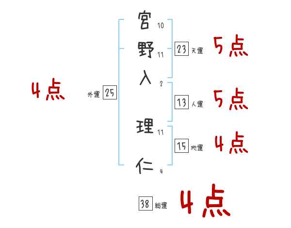 天運![]() | 宮野入理仁さんの天運は23画の5つ星!想像力に優れ活力がある。一代で成功し名誉を手に入れる。 家系が持つ宿命的な運勢を表します。祖先から受け継いだ苗字ですので自分の力が及びません。家柄を象徴します。 |