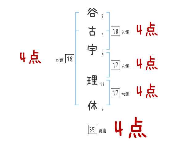 天運![]() | 谷古宇理休さんの天運は18画の4つ星!情熱的で剛気。忍耐力があり信頼される。 家系が持つ宿命的な運勢を表します。祖先から受け継いだ苗字ですので自分の力が及びません。家柄を象徴します。 |
