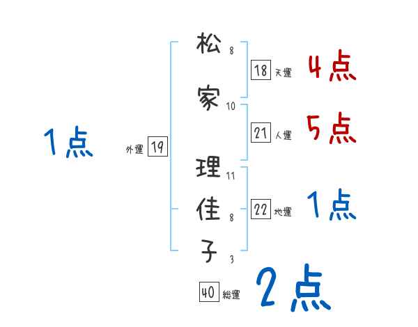 天運![]() | 松家理佳子さんの天運は18画の4つ星!情熱的で剛気。忍耐力があり信頼される。 家系が持つ宿命的な運勢を表します。祖先から受け継いだ苗字ですので自分の力が及びません。家柄を象徴します。 |