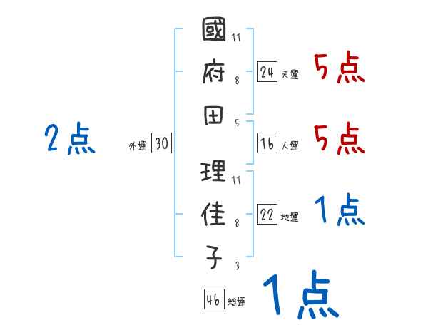 天運![]() | 國府田理佳子さんの天運は24画の5つ星!家庭運が良く順調な人生。金運にも恵まれる。 家系が持つ宿命的な運勢を表します。祖先から受け継いだ苗字ですので自分の力が及びません。家柄を象徴します。 |