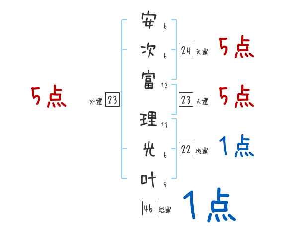 天運![]() | 安次富理光叶さんの天運は24画の5つ星!家庭運が良く順調な人生。金運にも恵まれる。 家系が持つ宿命的な運勢を表します。祖先から受け継いだ苗字ですので自分の力が及びません。家柄を象徴します。 |
