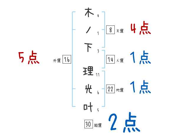 天運![]() | 木ノ下理光叶さんの天運は8画の4つ星!勤勉家。根気強く努力し成功する。忍耐力がある。 家系が持つ宿命的な運勢を表します。祖先から受け継いだ苗字ですので自分の力が及びません。家柄を象徴します。 |