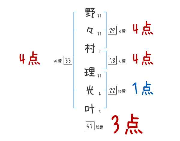 天運![]() | 野々村理光叶さんの天運は29画の4つ星!完全主義で才能がある。厳格な心の持ち主。 家系が持つ宿命的な運勢を表します。祖先から受け継いだ苗字ですので自分の力が及びません。家柄を象徴します。 |