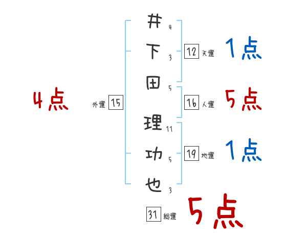 人運![]() | 井下田理功也さんの人運は16画の5つ星!人望が厚く大きく発展する。逆転成功が見える。 性格や才能などを表す2番目に重要な運勢です。人間関係や協調性、社会的な成功に影響します。主に20歳から50歳ぐらいまでの中年期の運勢を表します。 |