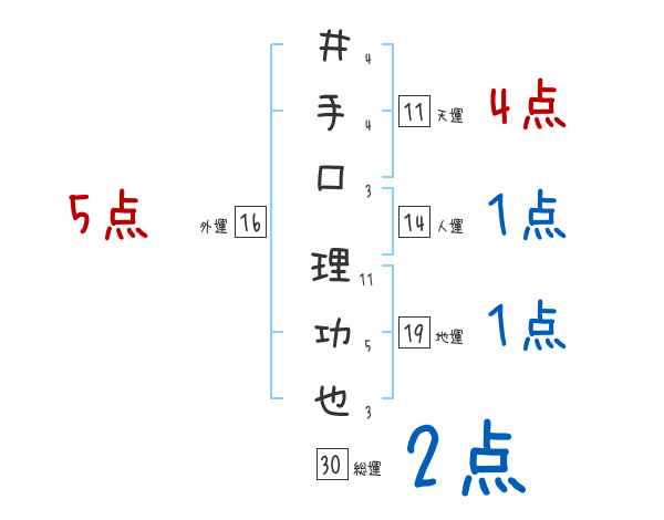| 天運  | 井手口理功也さんの天運は11画の4つ星!着実に富や地位を得る幸運な人生。家系が持つ宿命的な運勢を表します。祖先から受け継いだ苗字ですので自分の力が及びません。家柄を象徴します。 |